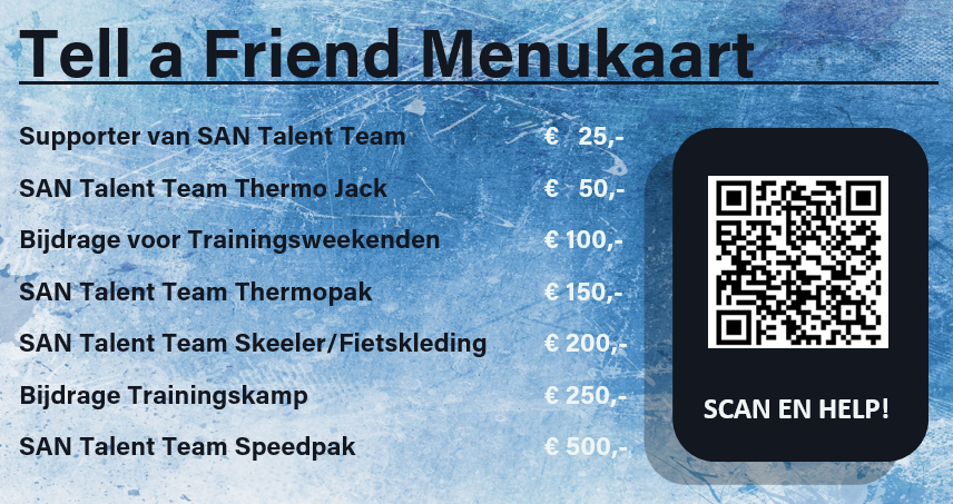 Welkom bij de SAN Talent Team 'Tell a Friend'-campagne! Jonge schaatstalenten van het SAN Talent Team werken elke dag keihard om hun droom, professioneel schaatser worden, te realiseren. Maar om deze droom werkelijkheid te maken, hebben we jouw hulp nodig!